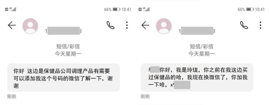不法分子向老年人发送保健品的推销信息,并诱导其添加微信详询。随后不法分子利用话术骗取老年人的信任后,诱导其转账汇款购买大量假冒伪劣的保健品或收到款后直接拉黑受害者。